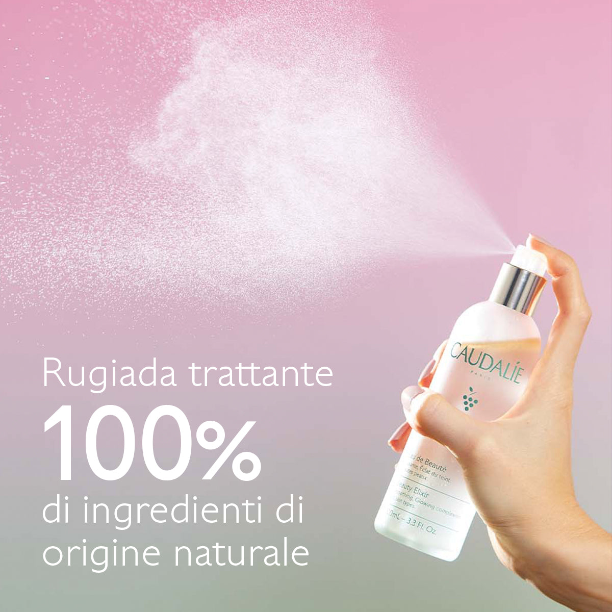 Beauty Elixir - l’Acqua di Bellezza è una rugiada trattante 100% naturale che rivela la luminosità dell’incarnato, restringe i pori e fissa il trucco in un istante.