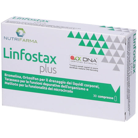 Linfostax Plus è un integratore alimentare con ortosifon, che favorisce il drenaggio dei liquidi corporei e la funzionalità delle vie urinarie, tarassaco che favorisce le funzioni depurative dell’organismo, meliloto che favorisce la funzionalità del microcircolo.