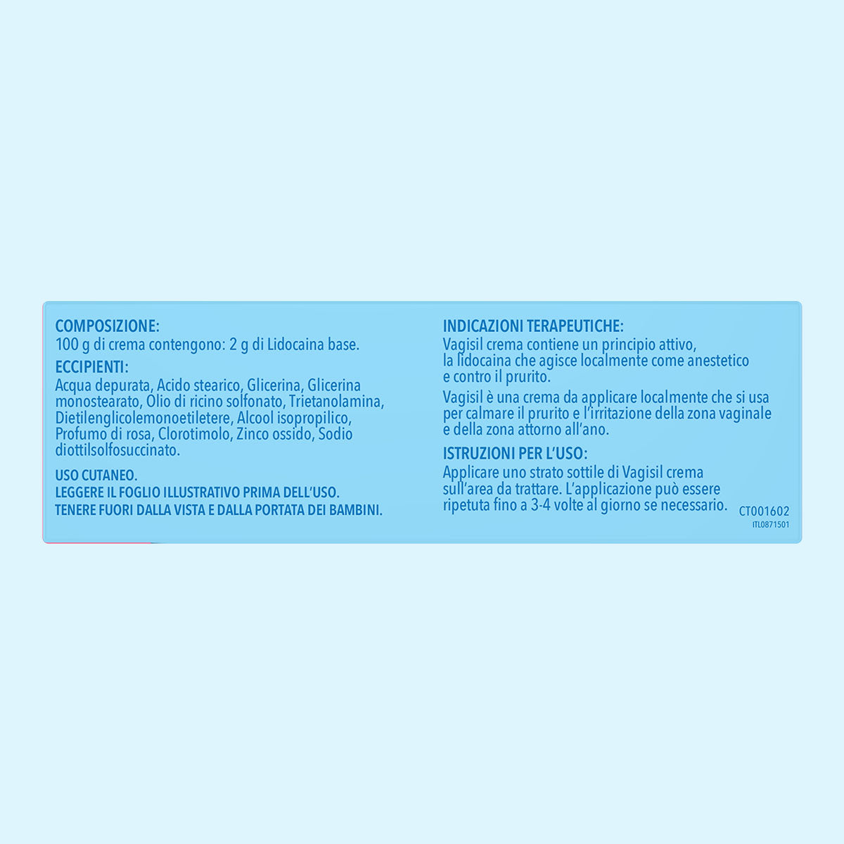La Lidocaina è un anestetico locale di tipo amidico, che agisce bloccando il dolore nella zona in cui viene applicato. Vagisil® Crema 2% Lidocaina è una crema anestetica ad uso topico indicata per calmare rapidamente la sensazione di prurito intimo, anche intenso, indipendentemente dalla causa.